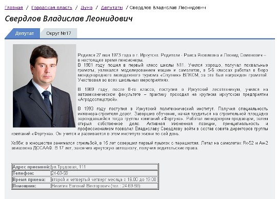 Владислав Свердлов, ставленник компании "Фортуна" Нины Чекотовой, избрался в Думу Иркутска в 2009 года. Тогда он указал в данных, что имеет высшее образование и закончил Иркутский политехнический институт. Правда, в информации на сайте Думы информация была представлена более обтекаемо: Свердлов предусмотрительно исключил из нее слово "закончил" и написал так: "В 1993 году поступил в Иркутский политехнический институт. Получил специальность инженера-строителя дорог."