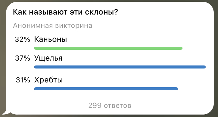 Телеграм-канал «Бурятия. Бабр. Дальше некуда» предложил читателям угадать, как называются эти склоны. Голоса опрошенных почти в равной степени распределились между тремя ответами, однако только 32 % выбрали верный – это подводные каньоны.
