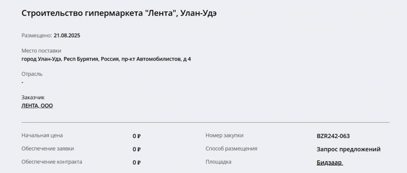 21 августа компания «Лента» разместила тендер на строительство гипермаркета в Улан-Удэ на проспекте Автомобилистов, дом 4.