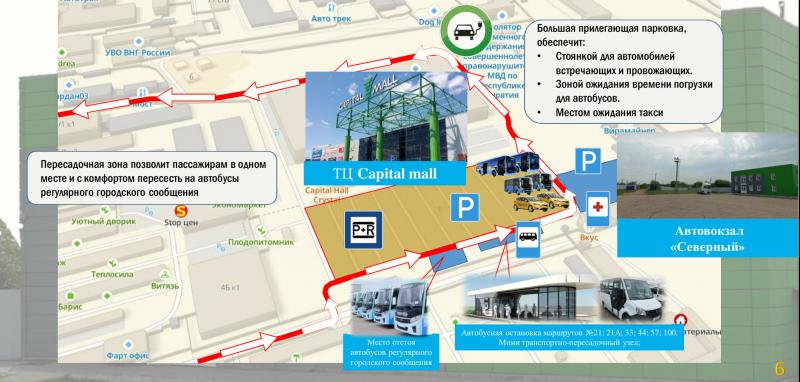 Минтранс обещает создать «мини транспортно-пересадочный узел». На схеме в презентации показана автобусная остановка для нескольких городских маршрутов, которая обеспечивает доступность лишь для ограниченной части города.
