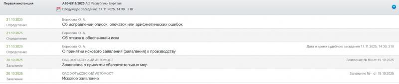 «Хотьковский автомост» отреагировал на расторжение 20 октября. Компания подала в Арбитражный суд Бурятии исковое заявление к «Бурятрегионавтодору». Содержание иска пока не раскрыто, но оно наверняка повторяет тактику годичной давности: заблокировать решение заказчика о расторжении контракта. Однако судья оставил в силе это решение, и контракт будет возобновлён только в том случае, если компания выиграет новое дело. Состоится судебное заседание 17 ноября.