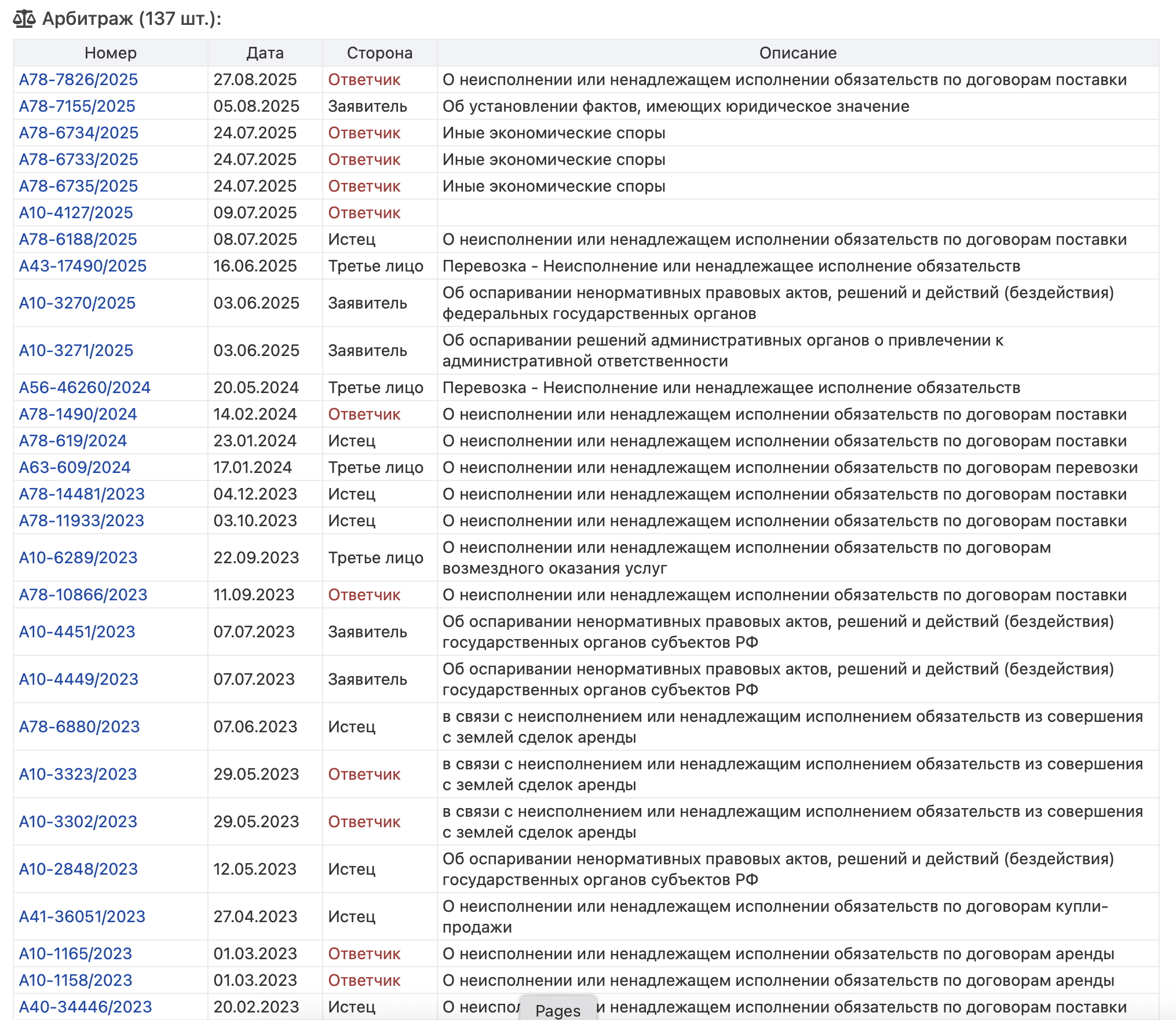 АО «Хиагда» суммарно участвовало в сотне арбитражных делах, среди которых были споры с подрядчиками и контролирующими органами, что говорит нам о системных проблемах в управлении договорами. В деле № А55-25137/2020, например, компания безуспешно пыталась взыскать с контрагента около восьми миллионов рублей, а в другом (№ А10-6234/2015) фигурировала как ответчик по иску о защите деловой репутации на 250 миллионов рублей. Масштаб всех претензий невелик, но здесь важна именно регулярность – в случае с «Хиагдой» она указывает на слабый контроль качества.