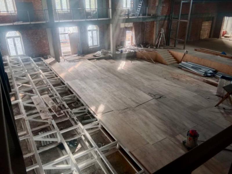 В главном зале установлены металлокаркас амфитеатра, черновой настил полов и голые стены, которые только-только готовят под покраску или обшивку. Никаких кресел и сценического оборудования. Свисающие провода, пыль столбом. Это и есть чистовая отделка помещения?