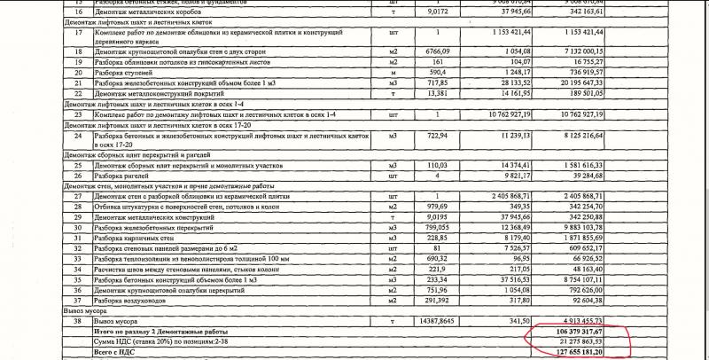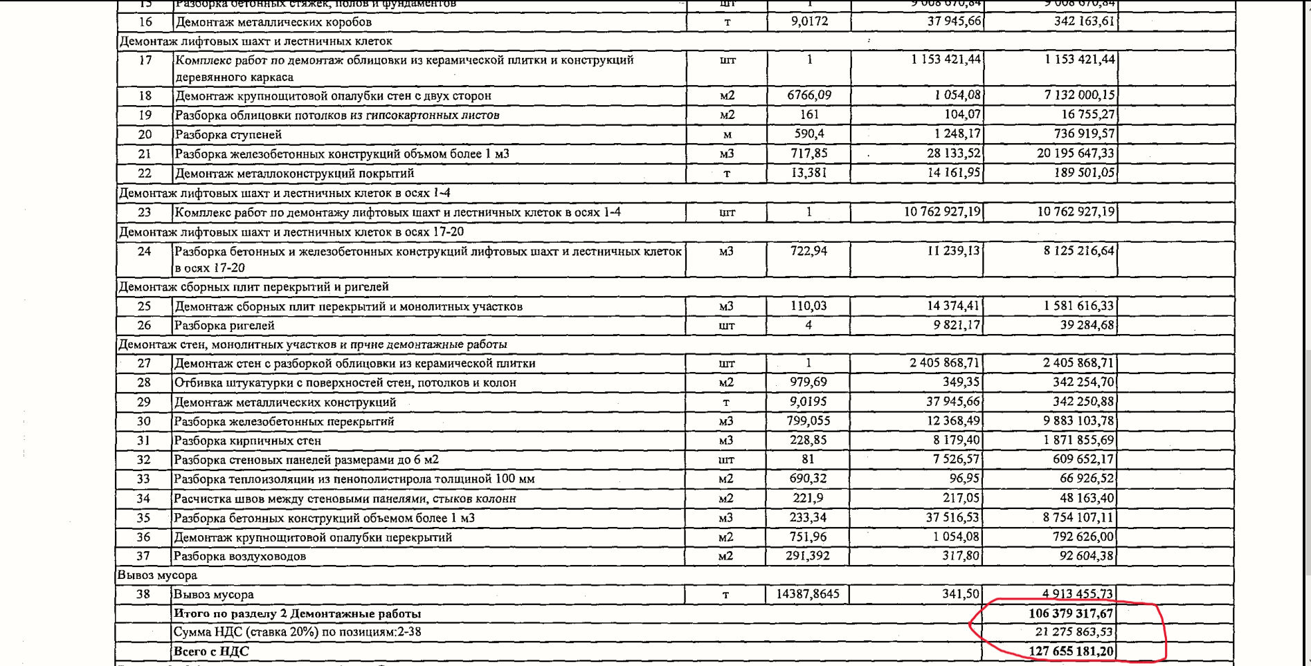 Также интересен раздел 2 сметы контракта — «Демонтажные работы». Согласно Приложению № 3 к допсоглашению, общая стоимость разборки конструкций составляет 106,3 миллиона рублей. Из чего же складывается такая сумма?