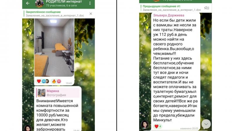 В родительском чате Доржиева занимает наступательную позицию: «Вы не можете оплачивать за туалетную бумагу, мыло, интернет, ремонт для своих детей!!! Все же работаете, наверное» (орфография и пунктуация сохранены).