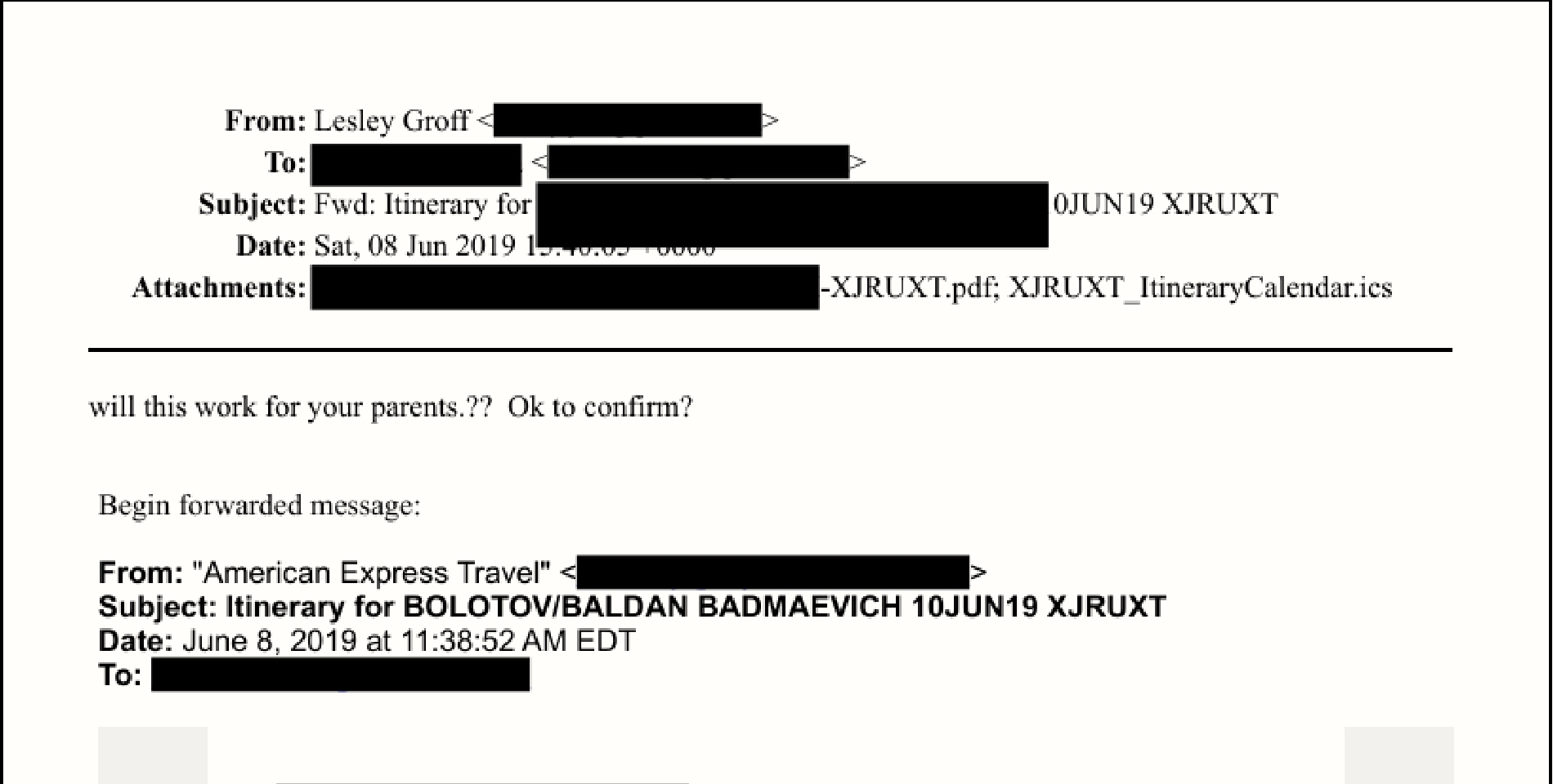 В письме от 8 июня 2019 года Лесли Грофф пишет Ренате (под псевдонимом Белла): «Я думаю, вся поездка выйдет дороговатой, как ни крути. Но я оформила билеты». Речь шла о сумме, превышающей несколько тысяч долларов.