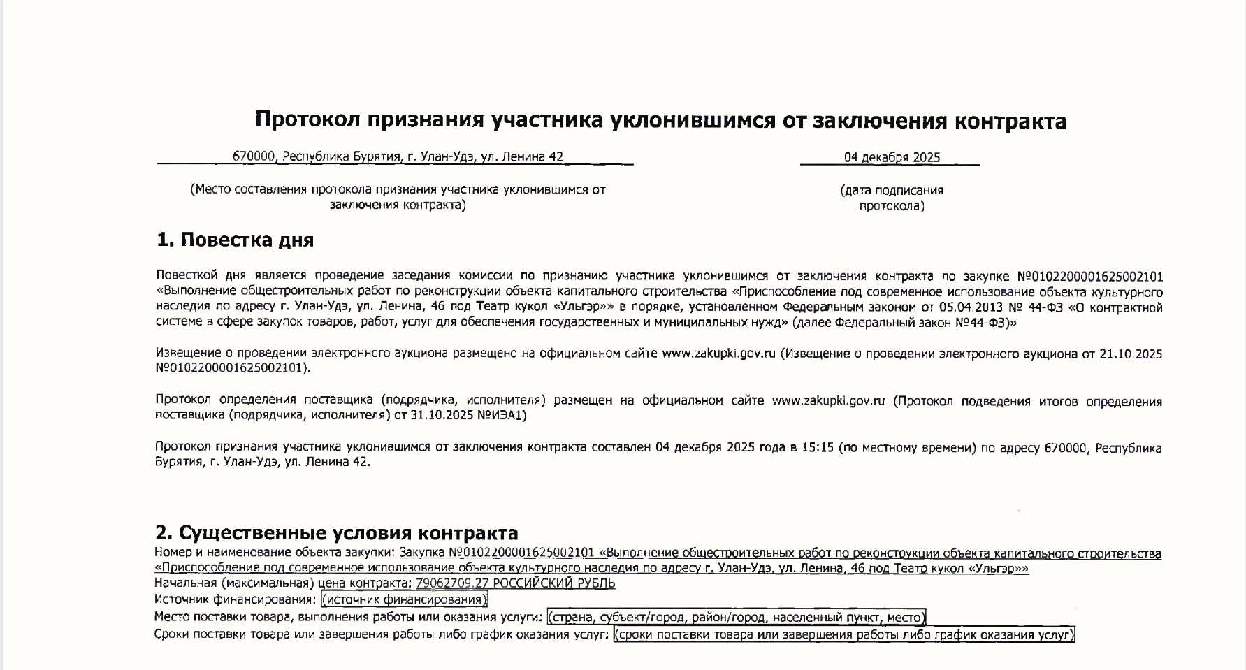 Управление капитального строительства (УКС) Бурятии в отчаянии делит крупный заказ на мелкие части, пытаясь хоть как-то привлечь исполнителей. В феврале 2026 года чиновники объявили четыре новых аукциона на общую сумму 230 миллионов рублей. Срок сдачи — 31 августа. Власти обещают, что театр распахнёт двери к следующему сезону.