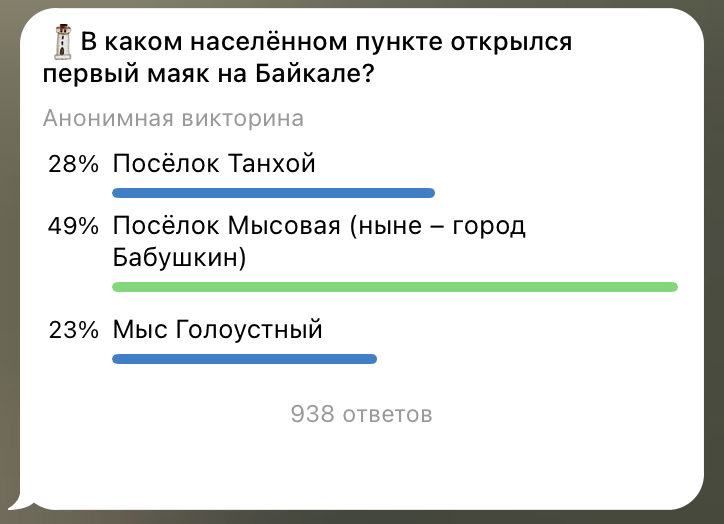 Телеграм-канал «Бурятия. Бабр. Дальше некуда» спросил у читателей, в каком населённом пункте открылся первый маяк на Байкале. В этот раз большая часть опрошенных (49 %) выбрала правильный вариант ответа – это посёлок Мысовая (ныне город Бабушкин).