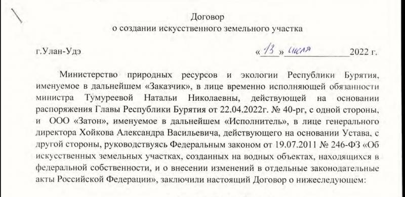 Договор о создании искусственного земельного участка был заключен ещё 13 июля 2022 года. Сторонами выступили министерство природных ресурсов и экологии Бурятии в лице тогда ещё врио министра Натальи Тумуреевой и ООО «Затон» (ОГРН 1143850039288 ), которое представляет гендиректор Александр Хойков. Городская администрация в изначальном соглашении не фигурирует, хотя оно и опубликовано на сайте мэрии. ООО «Затон» выступило исполнителем, обязавшимся за свой счёт создать на реке участок площадью 9,4 тысячи квадратных метров для размещения двухуровневой закрытой автостоянки на 100 мест и открытой парковки на 150 мест.