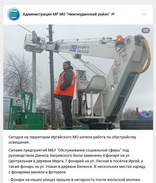 Так, администрация Нижнеудинского района похвалилась на днях, что на улицах Иргейского муниципалитета заменили уличные фонари, 12 штук. Ну то есть лампы. «После июльской грозы освещение восстановлено», – гордо пишет в октябре районная мэрия. Событие столь значимое, что приводят и славное имя руководителя работ.
