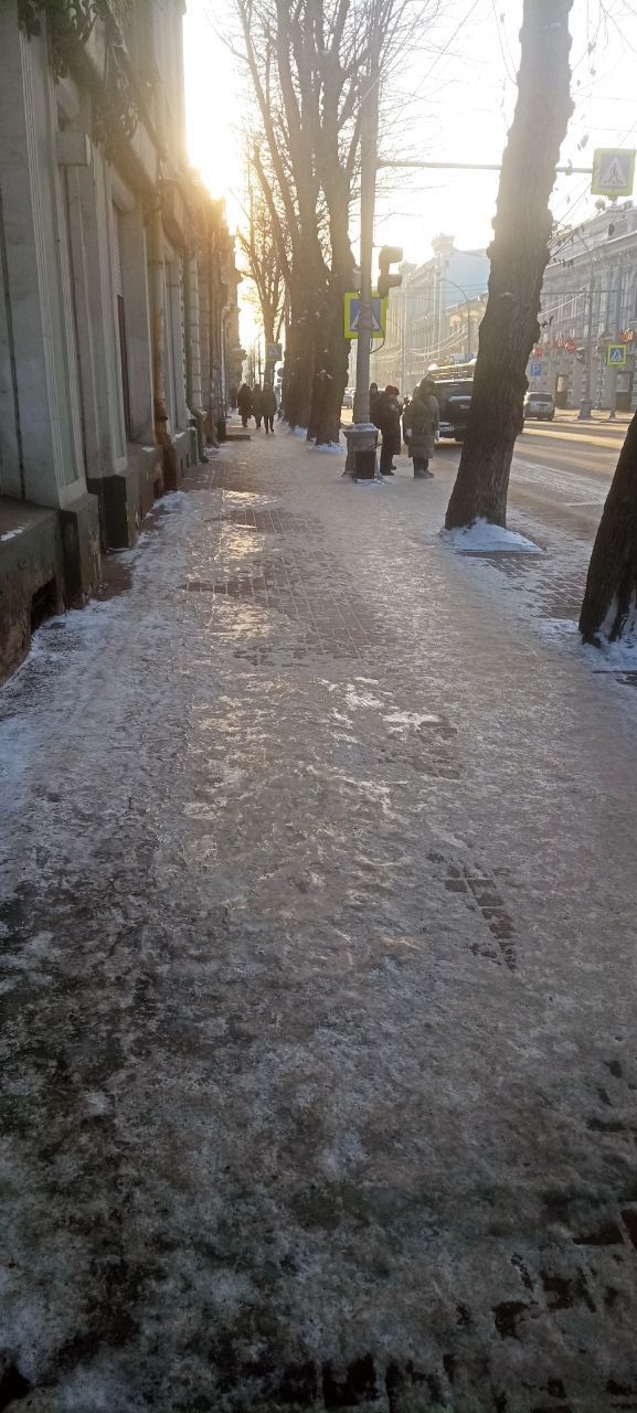 «Здравствуйте. Уберите, пожалуйста, снег и гололед с тротуара на улице Ленина в районе остановки «Стадион «Труд» и школы №15. Какое-то время было нормально. Несколько дней назад были интенсивные осадки. С тех пор не убирали снег и наледь на этом месте, в результате там все утоптано до зеркальной глади! При мне несколько человек поскользнулись. Ведь это же остановка общественного транспорта, рядом школа, очень много людей ходит каждый день! За несколько дней с последних снегопадов не нашлось времени убрать? Когда проведёте очистку этого участка?».