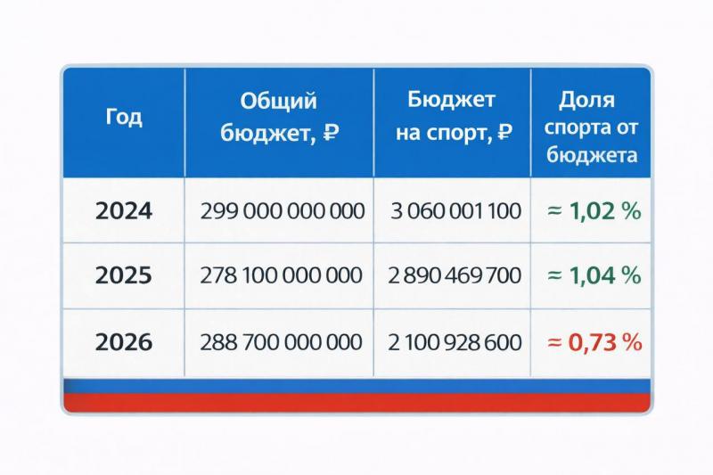 Деньги. Их выделяют на спорт всё меньше и меньше. Если в 2024 году на спорт выделяли 3 миллиарда, то в 2026 году это уже 2 миллиарда. То есть падение на 30%. Мы же с коллегами ещё год назад (сам был членом Общественной палаты) бились за то, чтобы регион тратил 3% от бюджета на спорт. Но 3 миллиарда — это 1%. А с уменьшением расходов в 2026 году этот показатель уже 0,7%. Вы представьте! Надо бороться за увеличение цифры!
