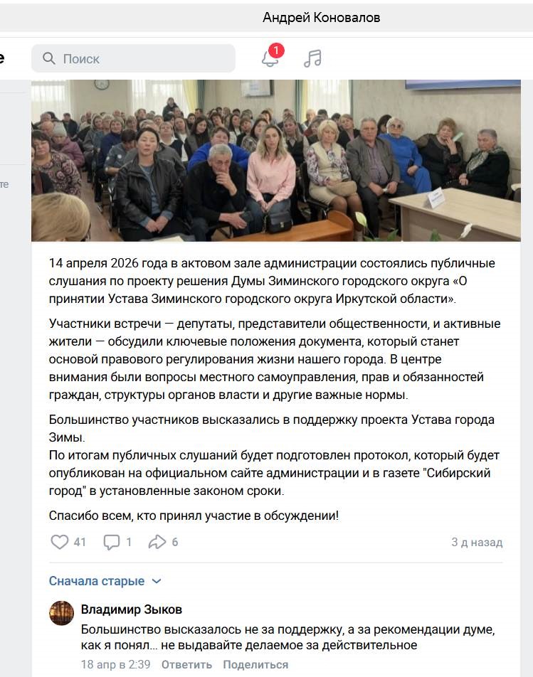 Также после общественных слушаний, состоявшихся в Зиме 14 апреля, Коновалов объявил о всенародном согласии с новым уставом, подкрепив это фотографией хмурых людей в зале. При этом на слушаниях разгорелись нешуточные баталии – да они и не могли не разгореться, поскольку на мероприятие прибыл весь актив иркутских «Новых людей». Без их участия мэр потихоньку согнал бы в зал бюджетников посмирнее, да и дело с концом.