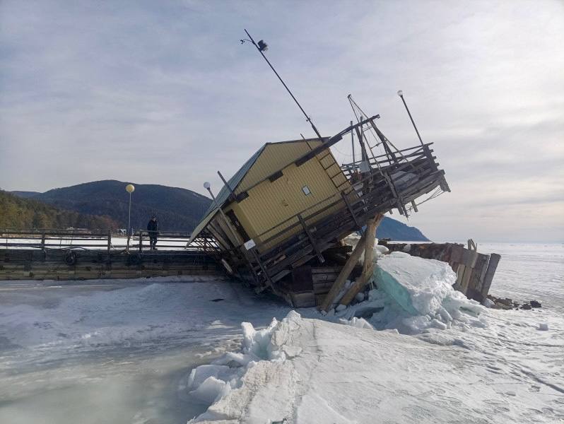 21 марта 2026 года в поселке Большие Коты лед буквально вывернул причал полевого стационара Лимнологического института Сибирского отделения Российской академии наук. Сооружение, простоявшее у берега больше двух десятилетий, не выдержало подвижки льда. Случилось это внезапно — новая трещина прошла прямо через место соединения двух частей причала. Короткое плечо конструкции оказалось перевернутым, настил с научными помещениями — опрокинутым.