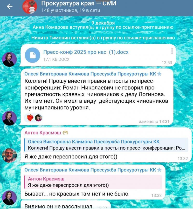 – Заявление прокурора края о причастности к делу Логинова краевых чиновников вызвало такую истерику в краевом правительстве, что решено было откатить назад. Пресс-служба краевой прокуратуры в чате со СМИ пишет, что Роман Николаевич оговорился или не расслышал.