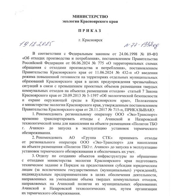 Министр экологии Красноярского края Владимир Часовитин объявил о решении проблемы с вывозом ТКО в Ачинском и Назаровском муниципальных округах. Часовитин подписал приказ об изменении потоков движения отходов. На основании этого документа отходы продолжат размещать на полигоне вблизи Ачинска, но не захоранивать, для последующего обезвреживания на соответствующих установках.