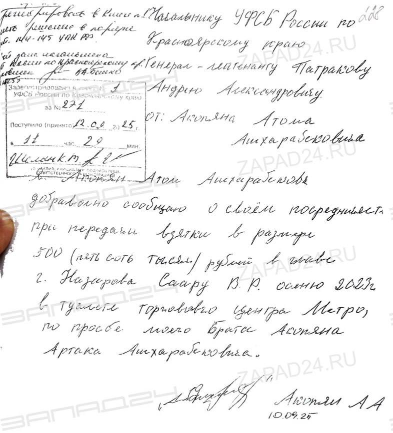 Денежные средства Владимир Саар получил в туалете торгового центра от брата подрядчика Атома Акопяна, о чем взяткодатель написал в явке с повинной сотрудникам ФСБ. В общей сложности за 2023 год от дорожников глава Назарово получил два миллиона рублей.