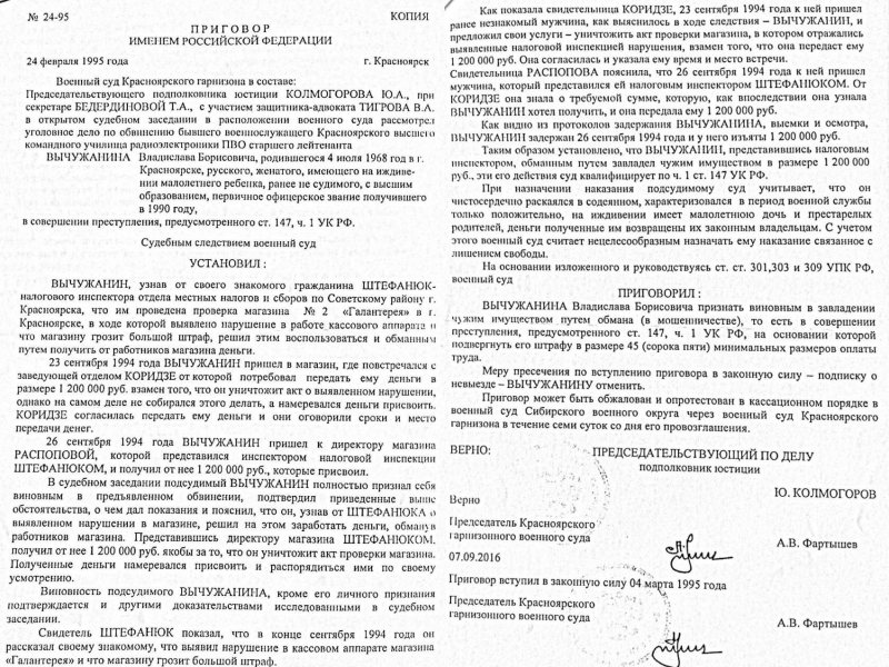 Позже, явившись к директору магазина и действуя под именем знакомого налогового инспектора, Вычужанин указанную сумму получил. И уже намеревался распорядиться деньгами по своему усмотрению, но был схвачен силовиками.