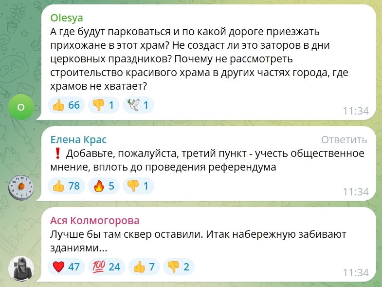 К посту мэра в телеграм-канале уже больше 470 комментариев. Обсуждения строительства храма проходят бурно. Кто-то против, чтобы храм строили на набережной, ведь это место отдыха. К тому же, архитектура собора слишком отличается от строений вокруг. Кто-то просит перенести строительство в другое место. А кто-то в принципе против строительства собора, ведь в Красноярске и так достаточно храмов и церквей. Ещё бытует мнение, что строительство собора на пожертвования в настоящее время не самое лучшее решение, потому оно может стать долгостроем.