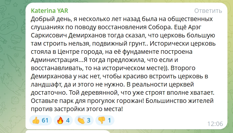 Исследования говорят о том, что участок может не выдержать строительство такого большого собора. Кстати, в комментариях к посту мэра жители упоминают и об этом.