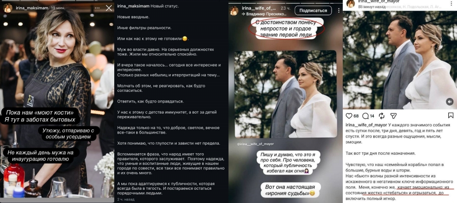 Скорее всего, кто-то провёл воспитательную беседу с Ириной, увидев столь пристальное внимание к жене мэра со стороны СМИ, блогеров и аналитиков. Потому что свои профили в соцсетях Ирина поспешила закрыть. По информации источников, близких к администрации города, в мэрии после этого вздохнули с облегчением.