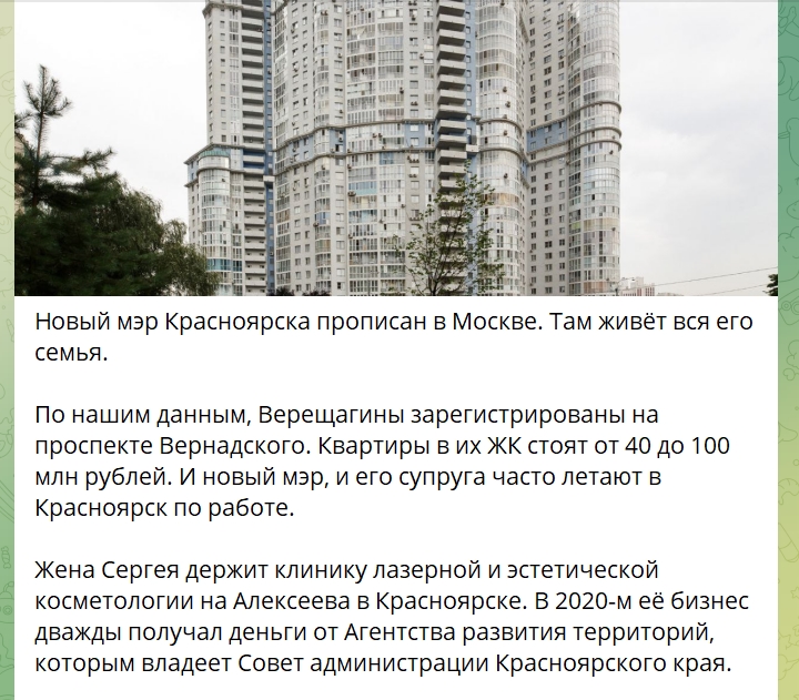 Далее, сразу же после инаугурации, тот же Kras Mash сливает информацию о московской прописке новоиспечённого и ещё горяченького мэра. Тогда же становится известно, что у его жены Ирины Верещагиной есть бизнес, который якобы получал деньги от краевой администрации.