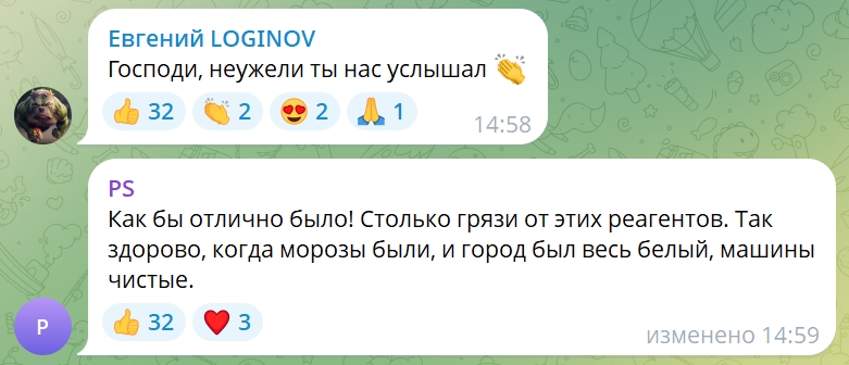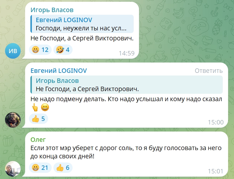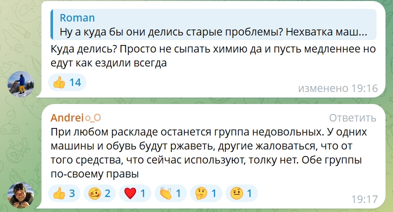 Похожая ситуация происходит и вокруг новости про отказ от технической соли и использование вместо неё ПГРТ и песчано-щебёночной смеси. Только теперь общественность разделилась на несколько лагерей. Кто-то благодарит Верещагина за верное решение, кто-то кричит о том, что вернётся «Бионорд», а кто-то подмечает, что недовольные будут всегда.