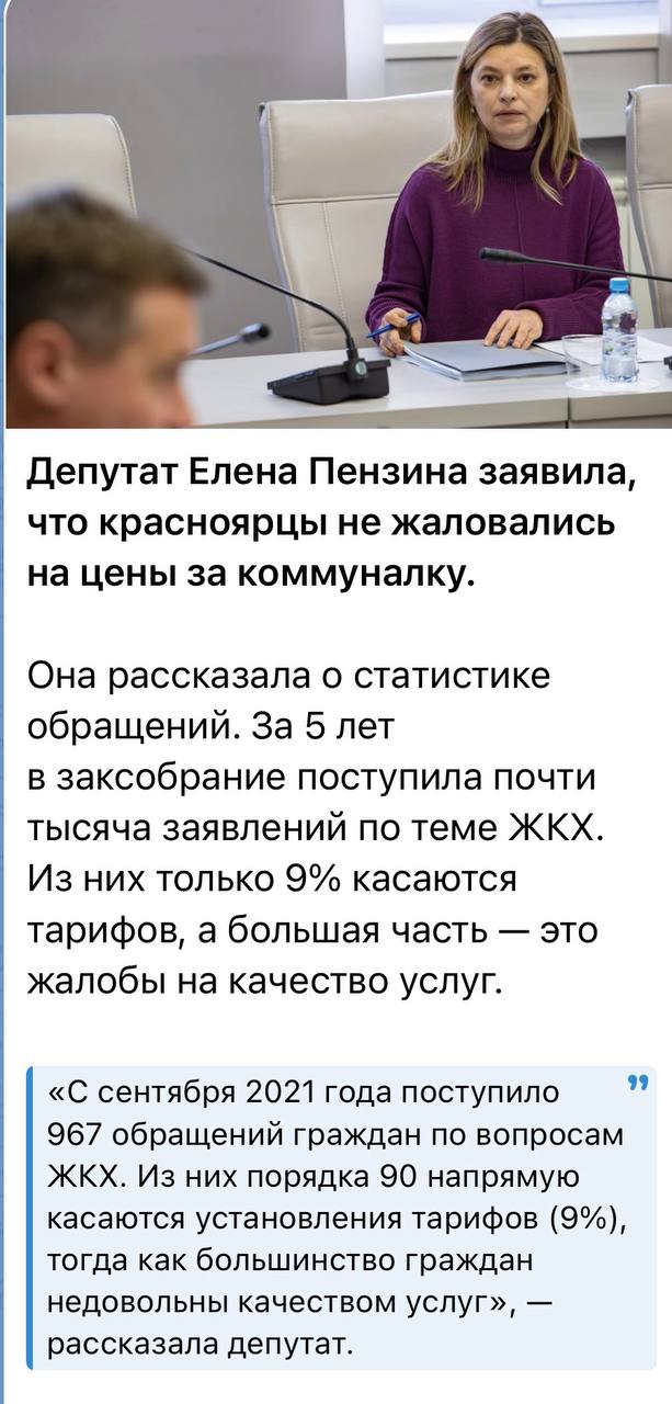 Если Елена Евгеньевна запамятовала, то я ей напомню как она рассказывала, что жители края вовсе не жалуются на высокие тарифы. Об этом тогда писали многие СМИ и telegram-каналы, например «Проспект Мира».