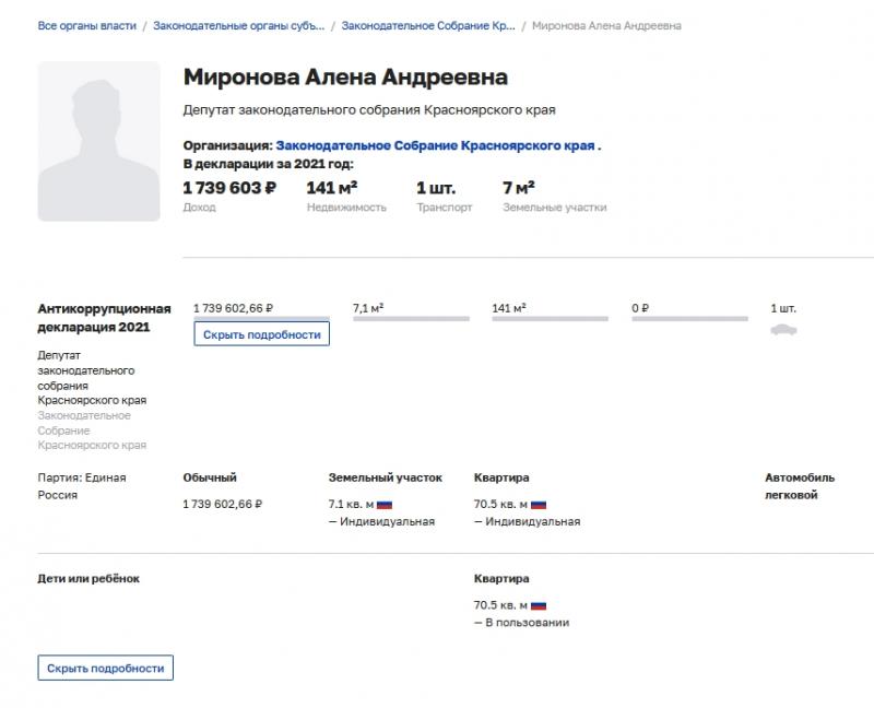 Согласно сайту «Декларации России» за 2021 год у депутата Заксобрания Алёны Мироновой доход составил миллион 739 тысяч рублей. Также в списке числится недвижимость, автомобиль и земельный участок. Квартира есть и у ребёнка Мироновой.