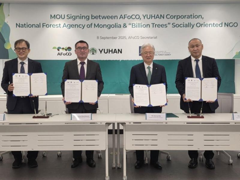 8 сентября в Сеуле был подписан Меморандум о сотрудничестве между корпорацией «Юхан», Азиатской организацией сотрудничества в области лесного хозяйства (АФоКО), Агентством лесного хозяйства Монголии и НПО «Миллиард деревьев». В рамках соглашение южнокорейская сторона поможет восстановить лес после пожара в сомоне Батсумбэр аймака Тув.