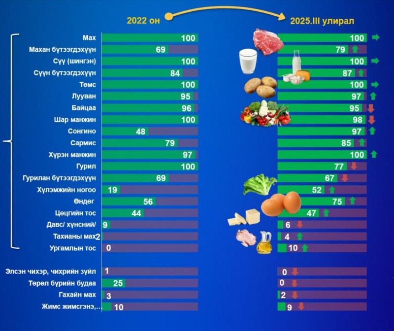 На фоне инфляционного давления и дорогого жилья власти делают ставку на развитие внутреннего производства продовольствия. За три года реализации программы «Продовольственная революция» были введены в эксплуатацию 53 завода и выпущено более тысячи новых видов продукции. Более 2500 предприятий получили льготные кредиты на сумму 1,3 триллиона тугриков. Создано 44 тысячи рабочих мест в пищевой, сельскохозяйственной и легкой промышленности.