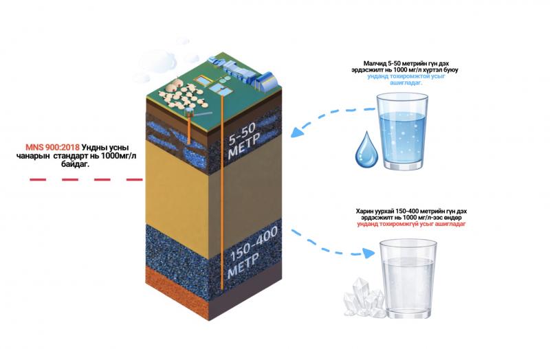 Ключевой аргумент строится на различии водоносных горизонтов. В тексте указано, что пастухи используют воду с глубины от пяти до 50 метров, при этом значительная часть колодцев в пустыне имеет глубину не больше десяти метров. Эта вода соответствует питьевым стандартам и имеет низкую минерализацию. А рудник Oyu Tolgoi берёт воду с глубины 150–400 метров, где она в три-четыре раза превышает допустимый уровень минерализации, абсолютно не пригодна для питья и не используется для бытовых нужд.
