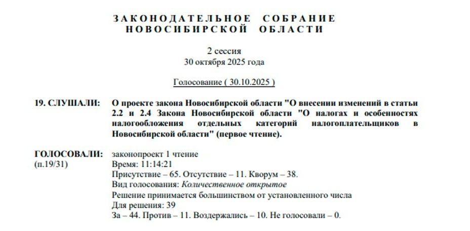 Речь идёт о тех самых пунктах, которые губернатор Андрей Травников продавил через Заксобрание 30 октября 2025 года. В первом чтении депутаты одобрили рост налога для машин до 100 лошадиных сил с 11 до 12 рублей за каждую «лошадь». Для самой массовой категории от 100 до 150 лошадиных сил ставка должна была вырасти с 16,5 до 18 рублей. Рост по обеим категориям — более 9 %.