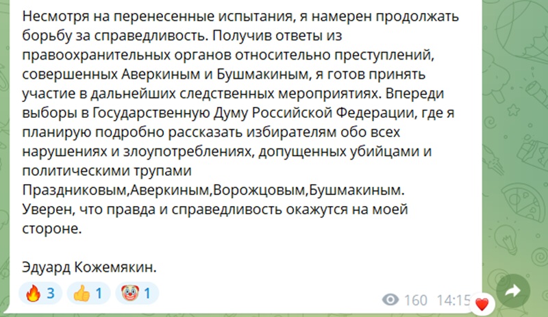 В планах экс-депутата — участие в следственных мероприятиях. Он утверждает, что Аверкин и Бушмакин замешаны в ряде нарушений законов РФ, и готов предоставить доказательства. Более того, Кожемякин пригрозил сорвать предстоящую кампанию в Госдуму. Он намерен рассказать избирателям всё, что знает о «политических трупах» и «убийцах». Учитывая, что он был внутри системы, компромата может хватить, чтобы обнулить рейтинг партии в регионе.