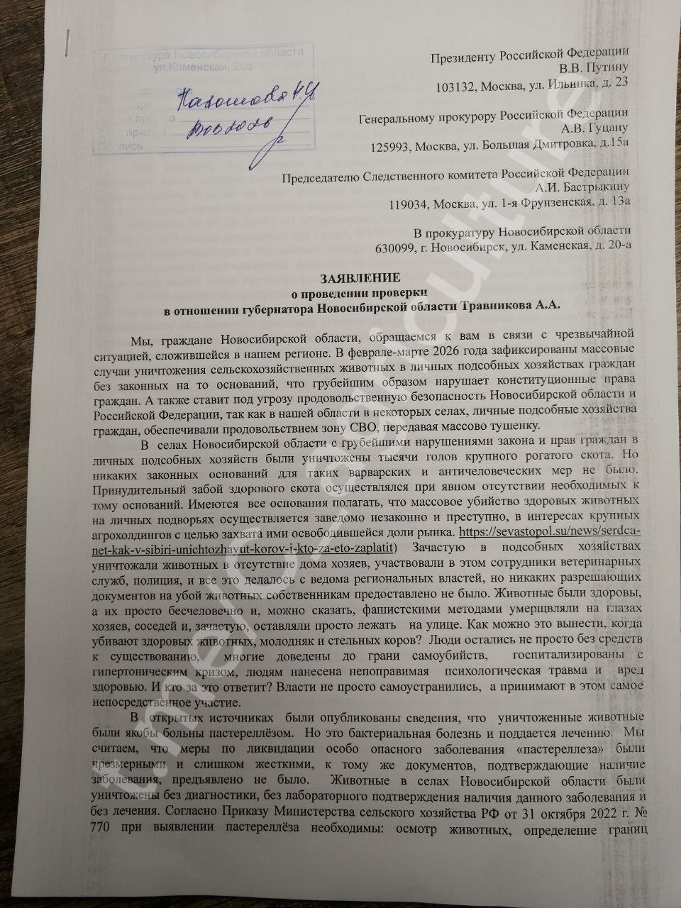 Терпение жителей лопнуло 23 марта. Инициативная группа приехала в региональную прокуратуру, чтобы подать коллективное заявление на действия губернатора Андрея Травникова. Главу региона обвиняют в подписании «преступных приказов» о массовом уничтожении скота. По мнению жителей, действия власти попадают как минимум под четыре статьи УК РФ: незаконное вторжение в жилище, причинение вреда имуществу, превышение должностных полномочий и жестокое обращение с животными. Люди требуют не просто компенсаций. Главное требование сегодня — отставка губернатора Травникова. Соответствующие заявления уже направлены президенту РФ, в Генеральную прокуратуру и Следственный комитет.