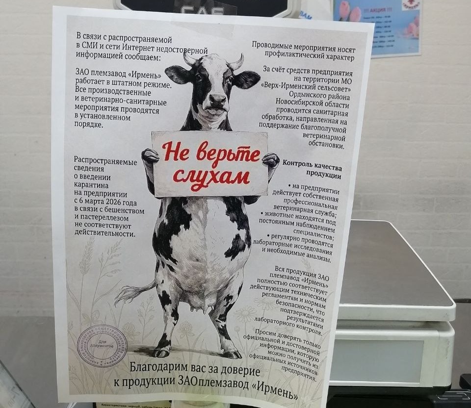 Чтобы сбить волну паники, в магазинах рядом с продукцией «Ирмени» появились листовки: мультяшная корова призывает «не верить слухам». Выглядит это, конечно, как издевательство над соседями. Верх-Ирмень географически зажата между очагами заражения в Козихе и Новопичугово. Все три населённых пункта стоят на одной водной системе, впадающей в Новосибирское водохранилище. Но вирус, по версии чиновников, удивительным образом «облетает» хозяйство депутата-единоросса.