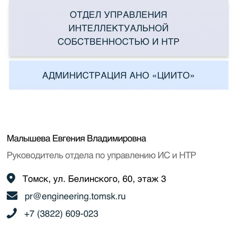 Евгения Малышева, фигурантка уголовного дела о выгораживании экс-мэра Томска Ивана Кляйна, заняла пост руководителя отдела по управлению интеллектуальной собственностью и научно-технологического развития АНО «ЦИИТО» (ОГРН 1137000001005). На это обратил внимание читатель Бабра.