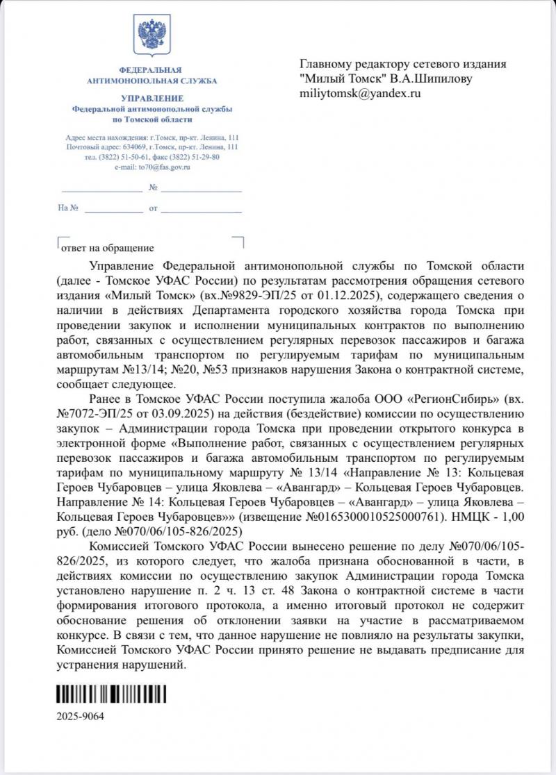 Томское УФАС в декабре 2025 года приняло решение о рассмотрении вопроса о недобросовестности второго перевозчика, исполнявшего контракт по муниципальным маршрутам 13 и 14. В начале декабря 2025 года стало известно о том, что департамент городского хозяйства администрации Томска направил в УФАС обращение, в котором утверждал о недобросовестности индивидуального предпринимателя Султана Хуршидова. Департамент сообщил о расторжении с ним договора в одностороннем порядке.