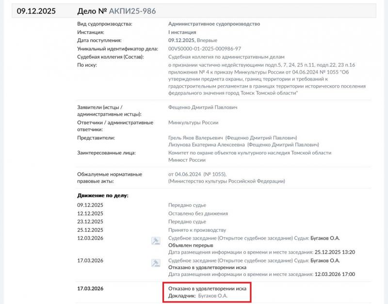 17 марта 2026 года Верховный суд отказал томичам в удовлетворении иска. Информация об этом содержится в картотеке ВС – дело №АКПИ25-986. И это не может не радовать. Если бы изменили приказ Минкульта, местные девелоперы тут же бы начали возводить железобетонные дома в исторических районах. Но бог миловал, как говорится.
