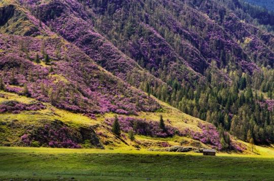 Алтай манит своей фантастической красотой в любое время года: летом – сочными лужайками, осенью – внеземными пейзажами, зимой – хрустальной сказкой, а весной – фиолетовым «туманом».