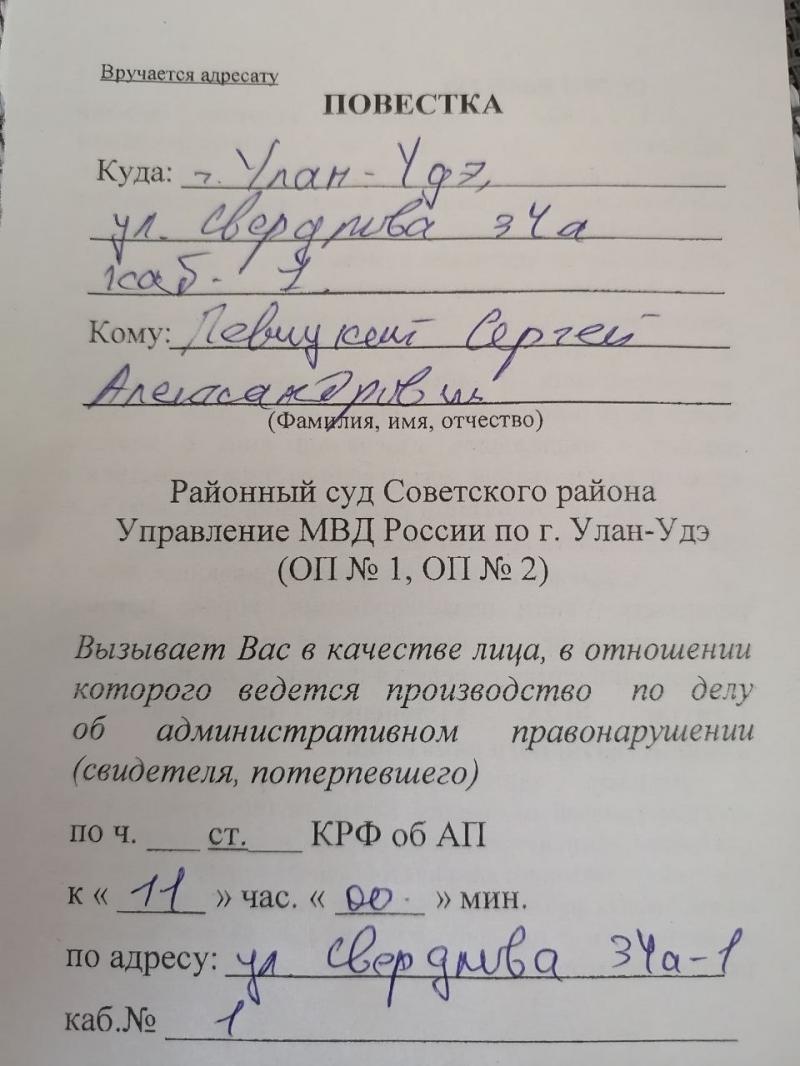 Сама же повестка составлена очень криво: не понятно, в качестве кого вызывают Левицкого (Свидетель или потерпевший? Почему не подозреваемый?), по какой конкретной статье КоАП РФ и отсутствует дата вызова.