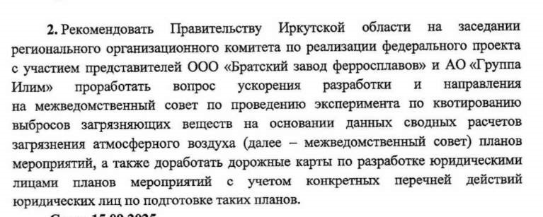 Там отдельным пунктом указано: рекомендовать правительству Иркутской области ускорить подготовку планов мероприятий по квотированию выбросов для Братского завода ферросплавов и группы «Илим». На основании данных сводных расчетов загрязнений атмосферного воздуха.