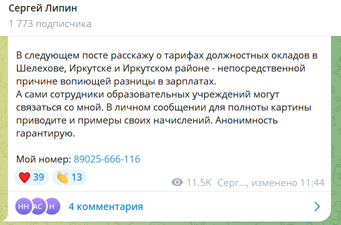 В своем телеграм-канале в целой серии публикаций экс-глава Шелехова (действуя, отметим, от имени местных учителей) обвиняет действующего мэра Шелеховского района Максима Модина в уничтожении системы образования и вопиющей несправедливости: зарплаты педагогов в городе, по его данным, в полтора раза ниже, чем у коллег в соседнем Иркутске. Этот вопрос, поднятый и освещенный с вполне конкретными цифрами, всколыхнул город: на публикации свыше одиннадцати тысяч прочтений, при том, что подписчиков у Липина едва больше тысячи.