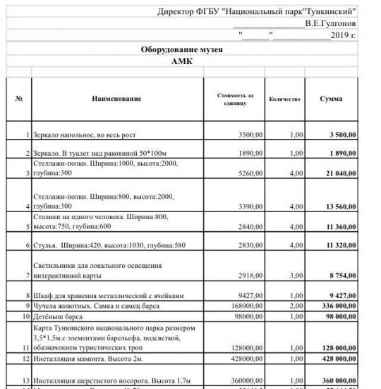 В распоряжении Бабра оказался интереснейший документ — список закупок Тункинского национального парка. Руководители учреждения потратили 6,5 миллионов рублей из бюджета на нужды своего музея, и по некоторым позициям есть вопросы.