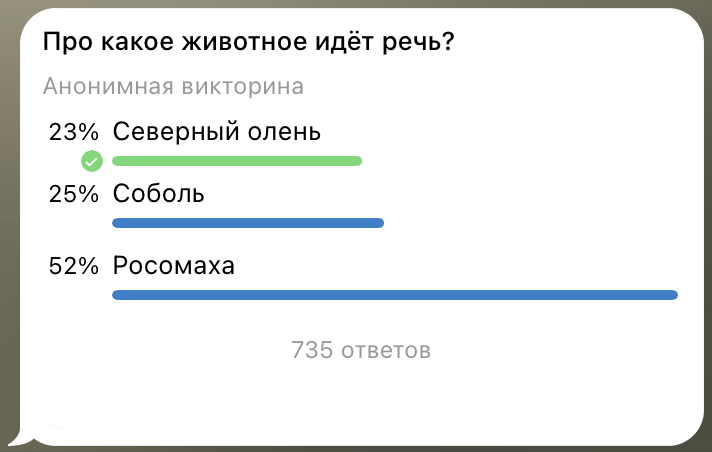 Телеграм-канал «Бурятия. Бабр. Дальше некуда» спросил читателей, про какое животное идёт речь. Только 23 % опрошенных догадались, что это Северный олень.
