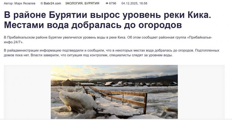 Самым ужасным инцидентом за декабрь в Прибайкалье стал потоп в селе Кика. 8 декабря глава лично приехал на берег реки, сделал фото и написал: «Ситуация контролируемая». А в ночь с 12 на 13 декабря (аккурат после юбилейных банкетов), река вышла из берегов. Ледяная каша (шуга) забила русло. Вода, не найдя выхода, хлынула в посёлок. Затопило дворы, подвалы и стайки. Люди в панике спасали имущество, но скот погиб, свиньи вмёрзли в лёд прямо в сараях.