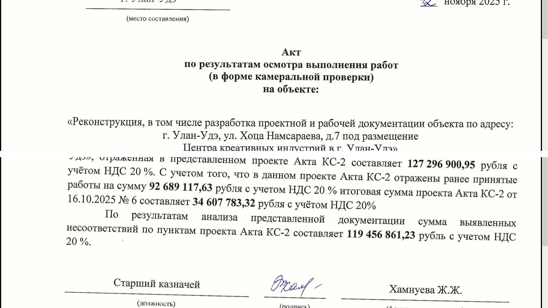 В октябре подрядчик ООО «Дом 2000» (ОГРН 1020300904073) попытался получить деньги за якобы выполненный объём работ. Компания предъявила к оплате акт выполненных работ на сумму 127,2 миллиона рублей, заявив о полном завершении демонтажа и подготовки здания. Но в распоряжении Бабра оказался акт камеральной проверки Управления Федерального казначейства (УФК) по Бурятии от 12 ноября 2025 года.