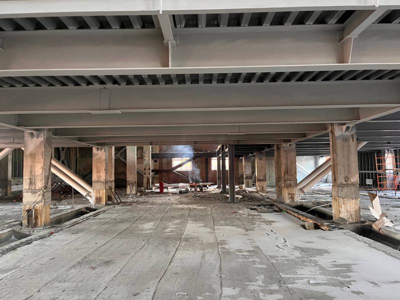 Внутри помещений на плитах перекрытия лежит снег. Строительные леса установлены лишь на 15% площади фасада, и на них нет ни одного рабочего (попросили разойтись для фото?).