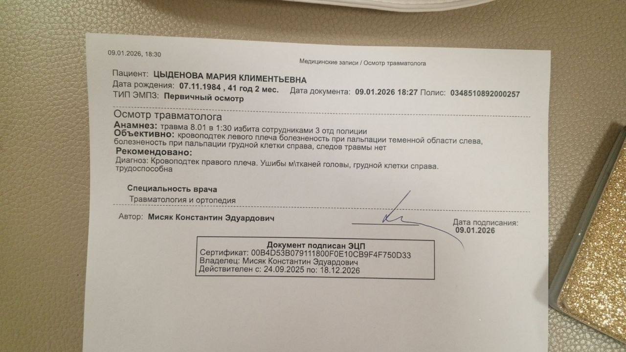 Официальный комментарий полиции гласит, что физическая сила и спецсредства не применялись при задержании. Но это утверждение опровергает документ из травмпункта. Мария заявила адвокату, что в отделе ей заломили руки, нанесли удары по спине и голове. 9 января врачи осмотрели пострадавшую и отметили кровоподтёк правого плеча, ушибы мягких тканей головы и грудной клетки справа.