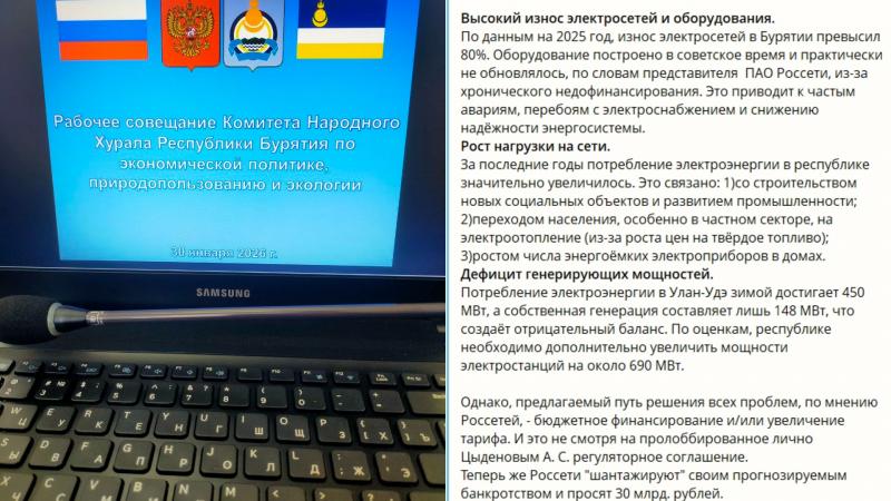 Кроме того, депутат Хурала Эржена Чимитцыренова на рабочем совещании комитета 30 января сообщила, что компания «Россети» требует из бюджета 30 миллиардов рублей, угрожая банкротством. При этом износ сетей в Бурятии превышает 80%. Подстанция «Нижний Саянтуй» перегружена на 240%.